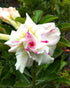 Trumpet shaped triple petal white and red coloured adenium, rose stripes over the white petals gives vibrent view to the adenium flowers, usually have flowers in bunch. Best home flowering plant suited for India’s tropical climatic conditions.